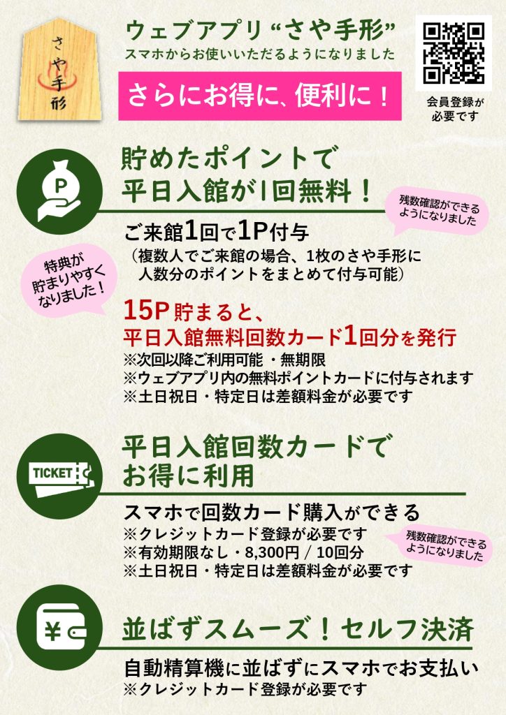 これに伴い、これまでにご利用いただいておりました、紙製の「さやの湯処カード」は新規発行を終了いたしました。