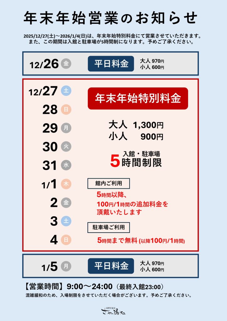 2025/12/27(土)~2026/1/4(日)は、年末年始特別料金にて営業させていただきます。